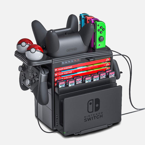 Our Nintendo Switch Charging Storage Stand™ will charge your Pro Controllers, Joy-Con's and PokéBalls while storing additional accessories in a nice and organized setup.